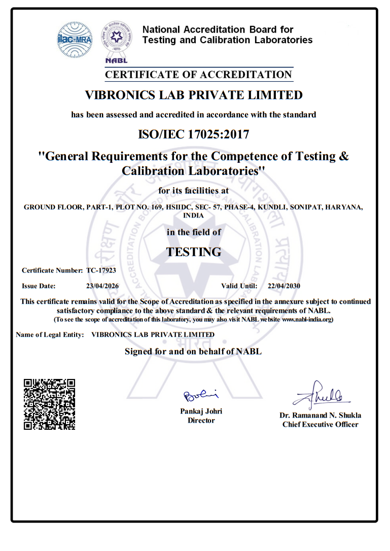 VIBRONICS LAB PRIVATE LIMITED is accredited by National Accreditation Board for Testing and Calibration Laboratories (NABL) India for ISO 17025:2017 standard.Click below to check the NABL certificate and scope of testing.